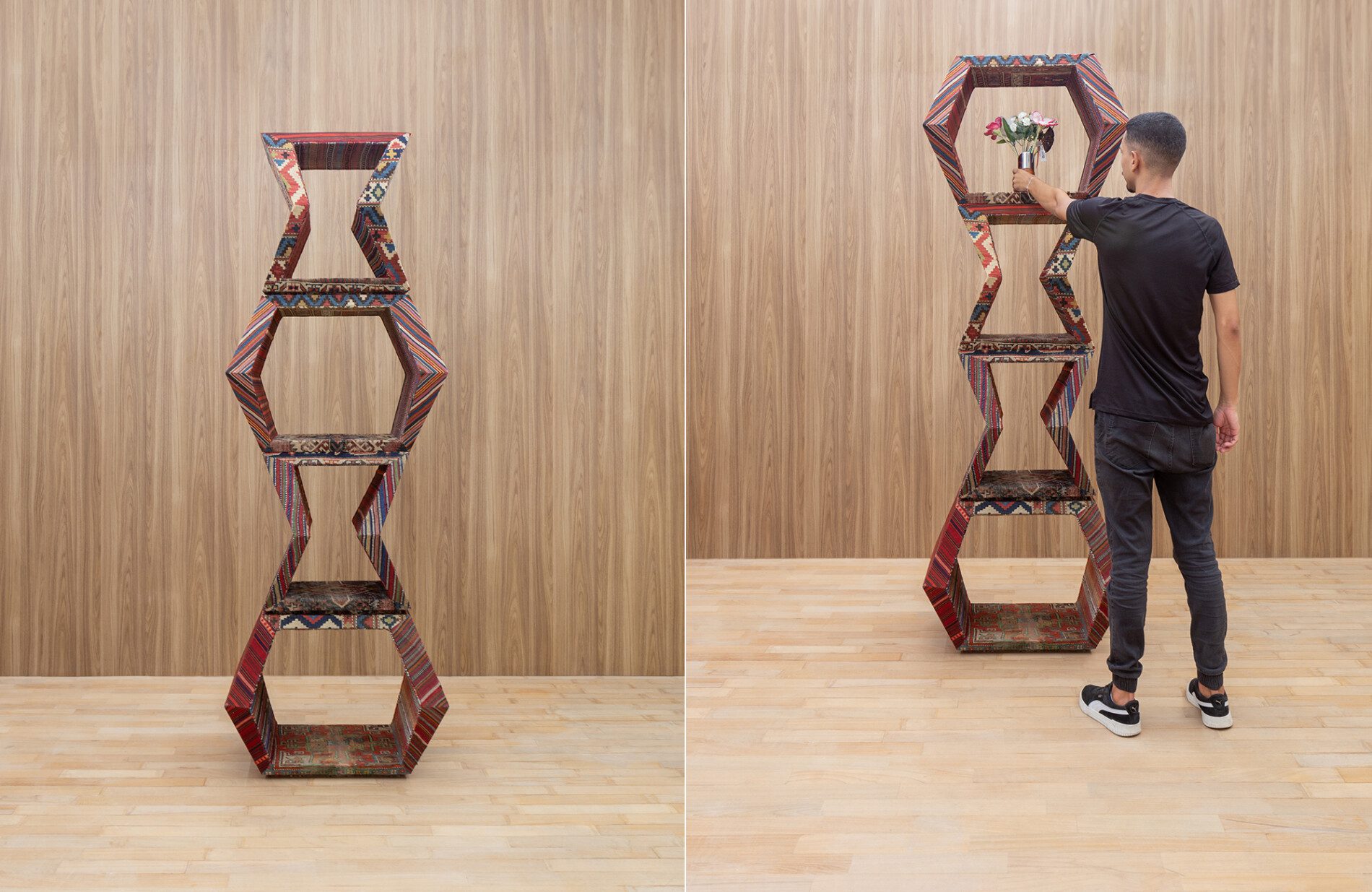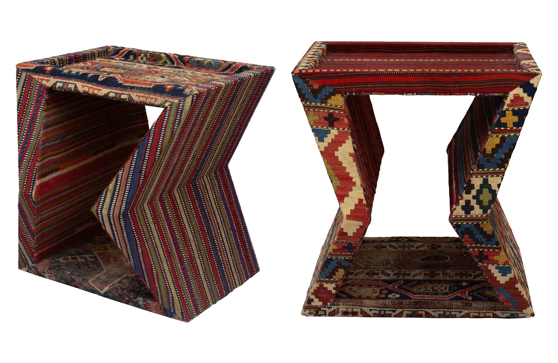 Fragmentos de antigos tapetes orientais cobrem peças de mobiliário multifacetadas, de formato geométrico, que se encaixam dando origem a diversas configurações: assim foi pensada a linha Modulus, criação do arquiteto Henrique Steyer, apresentada pela By Kamy (@bykamy) durante a DW! SP 2024. Versáteis, os pequenos móveis funcionam como mesa de apoio, banquinho, pufe e revisteiro quando usados individualmente. Empregados em conjunto, os módulos podem ser alinhados para compor um banco, empilhados para desenhar estantes, biombos ou o que mais a imaginação desejar.
