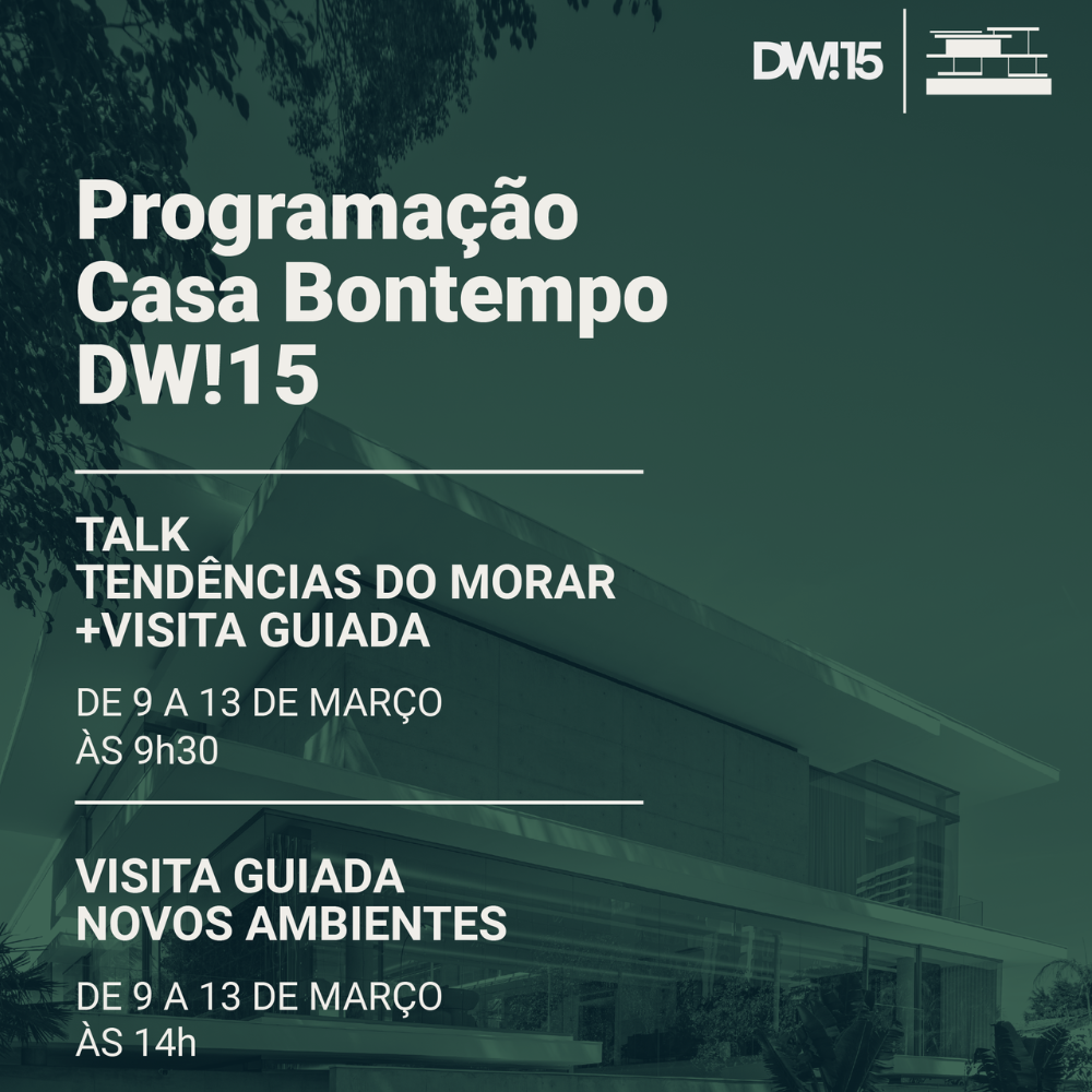 Na DW! Semana de Design de São Paulo, a Casa Bontempo contará com uma agenda diária de ações que apresentam o conceito do espaço e os caminhos de pesquisa da marca para o morar contemporâneo. As manhãs começam com um talk dedicado ao relatório de tendências desenvolvido pela moveleira, seguido de visita guiada pelos ambientes inoperacionais. À tarde, o público pode participar de um tour focado nos novos ambientes e nos pré-lançamentos preparados para o festival.