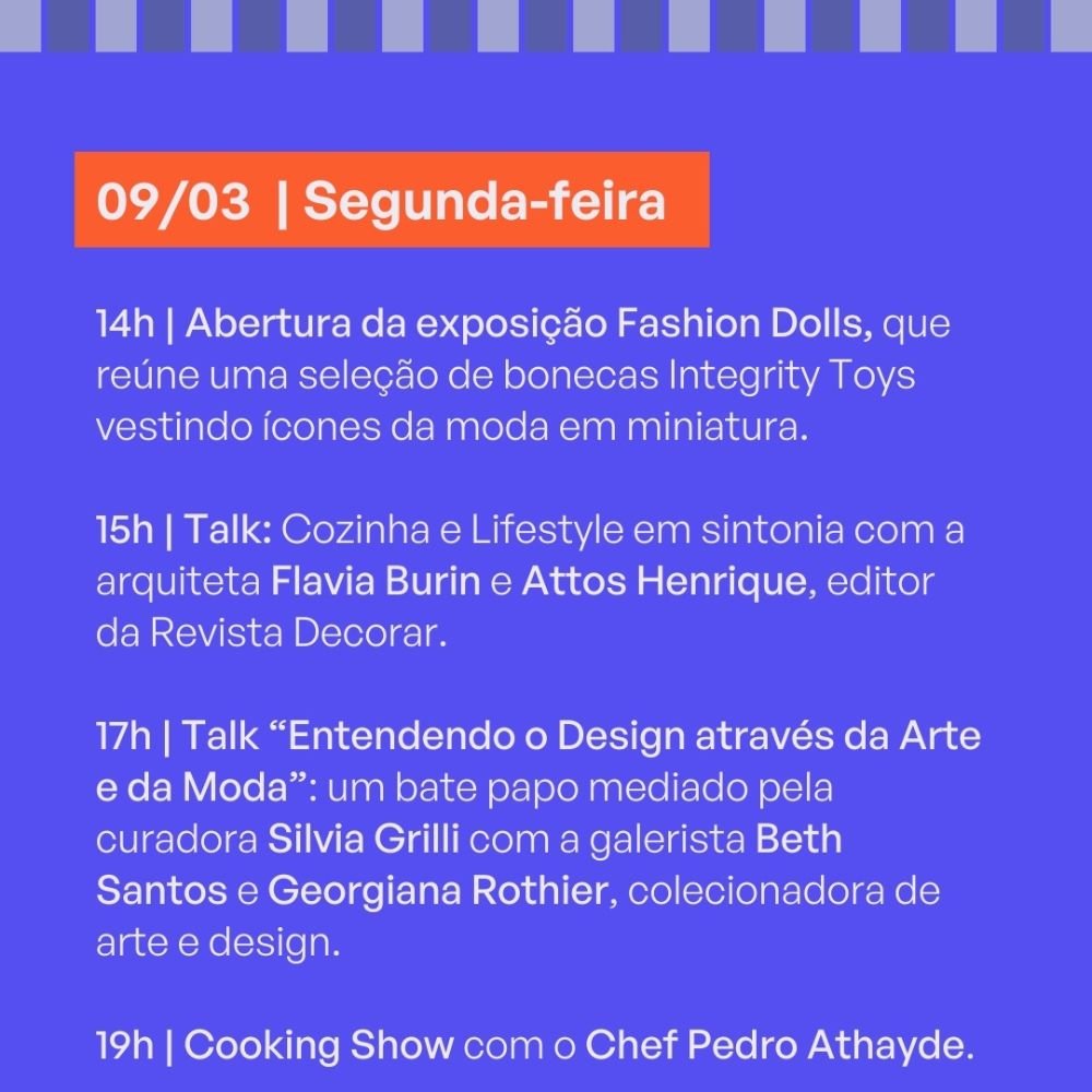 No showroom da marca, a programação da DW!15 propõe um olhar transversal sobre criatividade e estilo de vida. Entre os destaques está a exposição Fashion Dolls, que apresenta bonecas da marca Integrity Toys vestidas com versões miniaturizadas de criações icônicas da moda. Ao redor dessa mostra, uma série de talks e cooking shows discute a relação entre moda, arte, arquitetura e comportamento, encerrando cada dia com experiências gastronômicas.