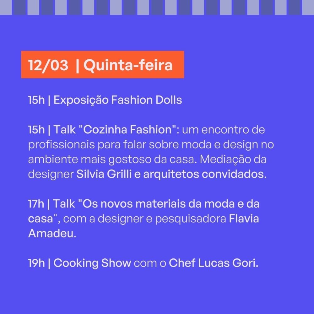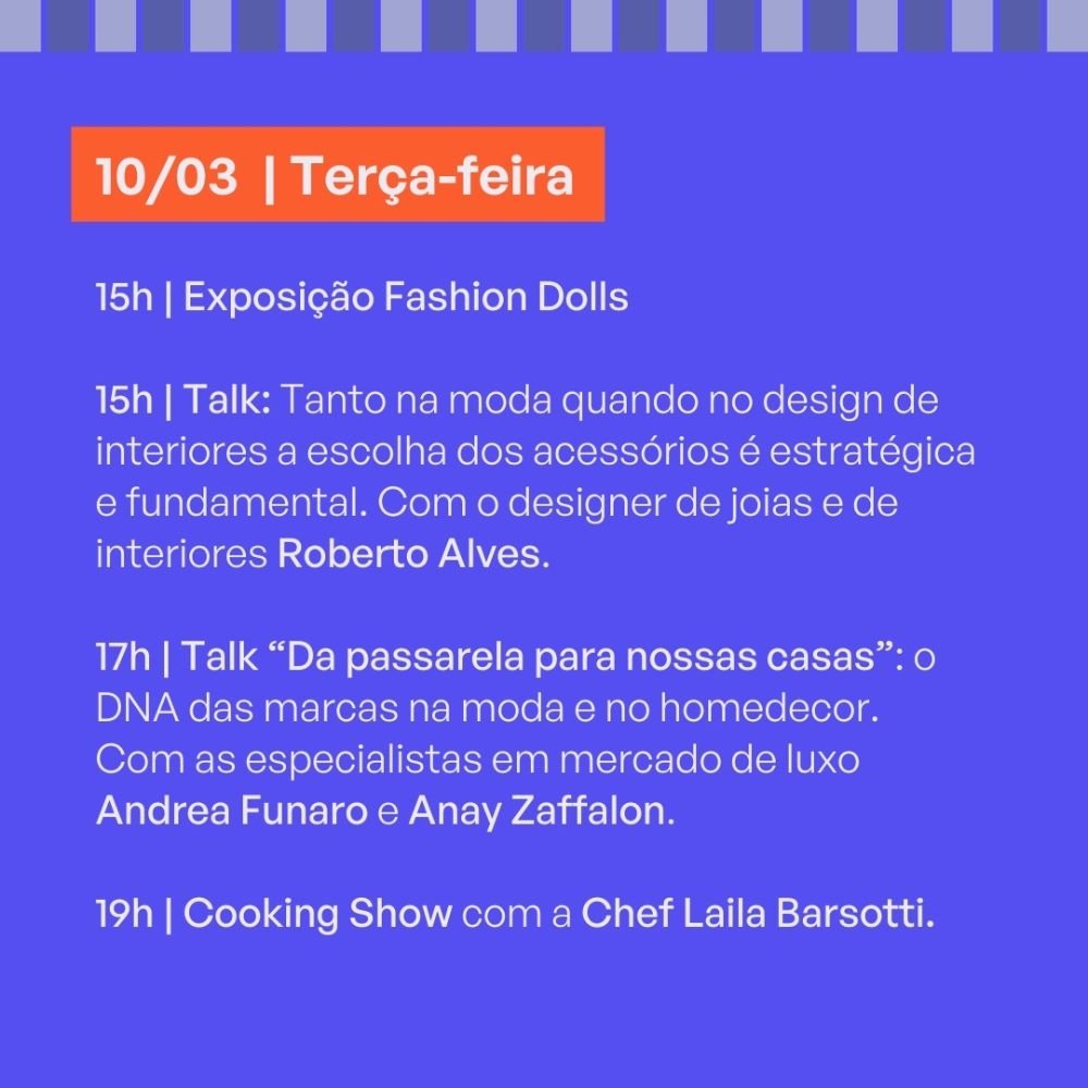 – 17h – Talk “Da passarela para nossas casas: o DNA das marcas na moda e no homedecor”