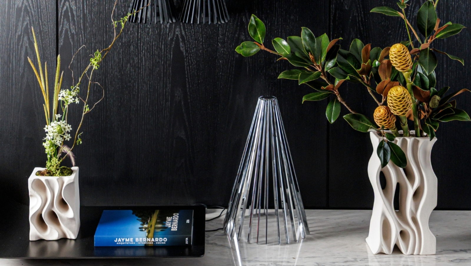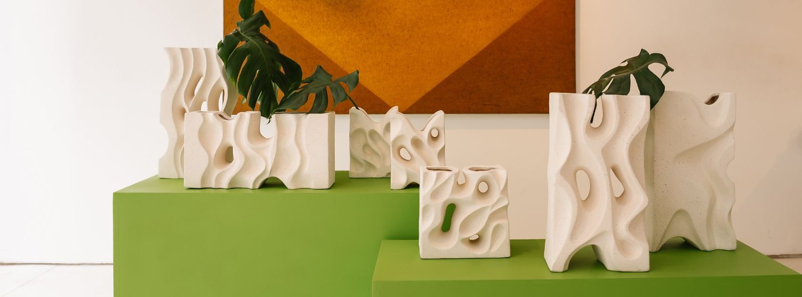 Desenvolvida em parceria com a marca DIEEDRO, do arquiteto e designer Jayme Bernardo, a coleção Raiz investiga a estrutura das raízes como matriz formal e conceitual. A linha de vasos parte da observação dos sistemas subterrâneos que sustentam a vida vegetal, transformando essa lógica orgânica em superfícies tridimensionais escultóricas.