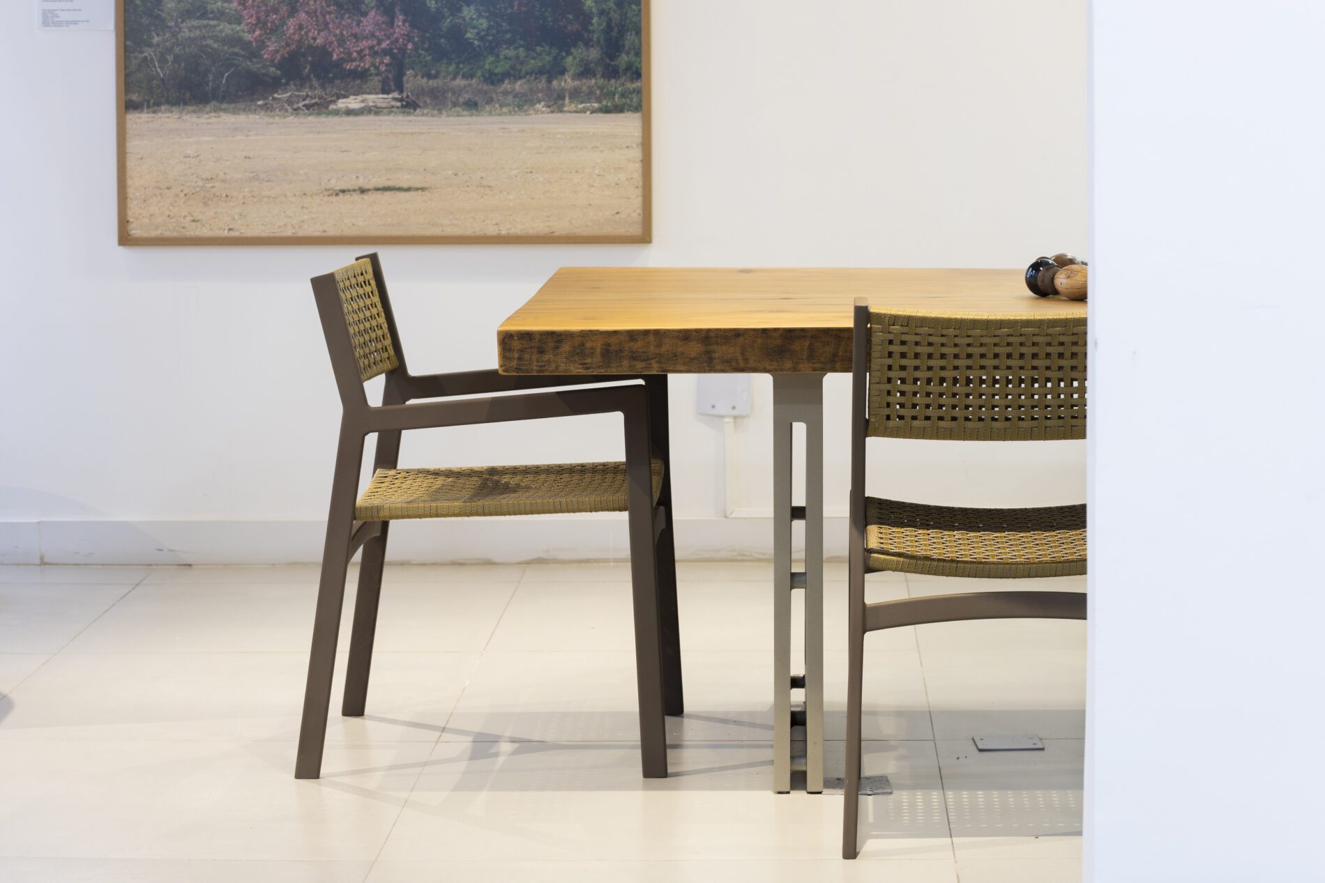 Outro parceiro de longa data da empresa, o designer Zia Costa apostou na leveza e no minimalismo ao criar a poltrona Trama. Na peça, a delicada estrutura de alumínio com pintura eletrostática é arrematada por um trançado de pontos abertos, que evoca a ideia de transparência. Zia também desenvolveu a cadeira Brisa, nas versões com e sem braços, móvel que se destaca pelo perfil elegante e o minucioso estudo de ergonomia envolvido em seu desenho.
