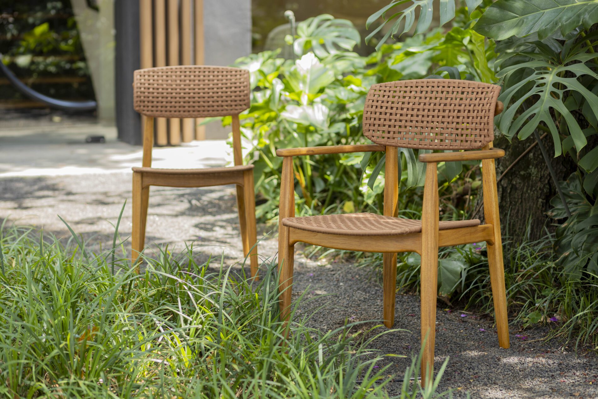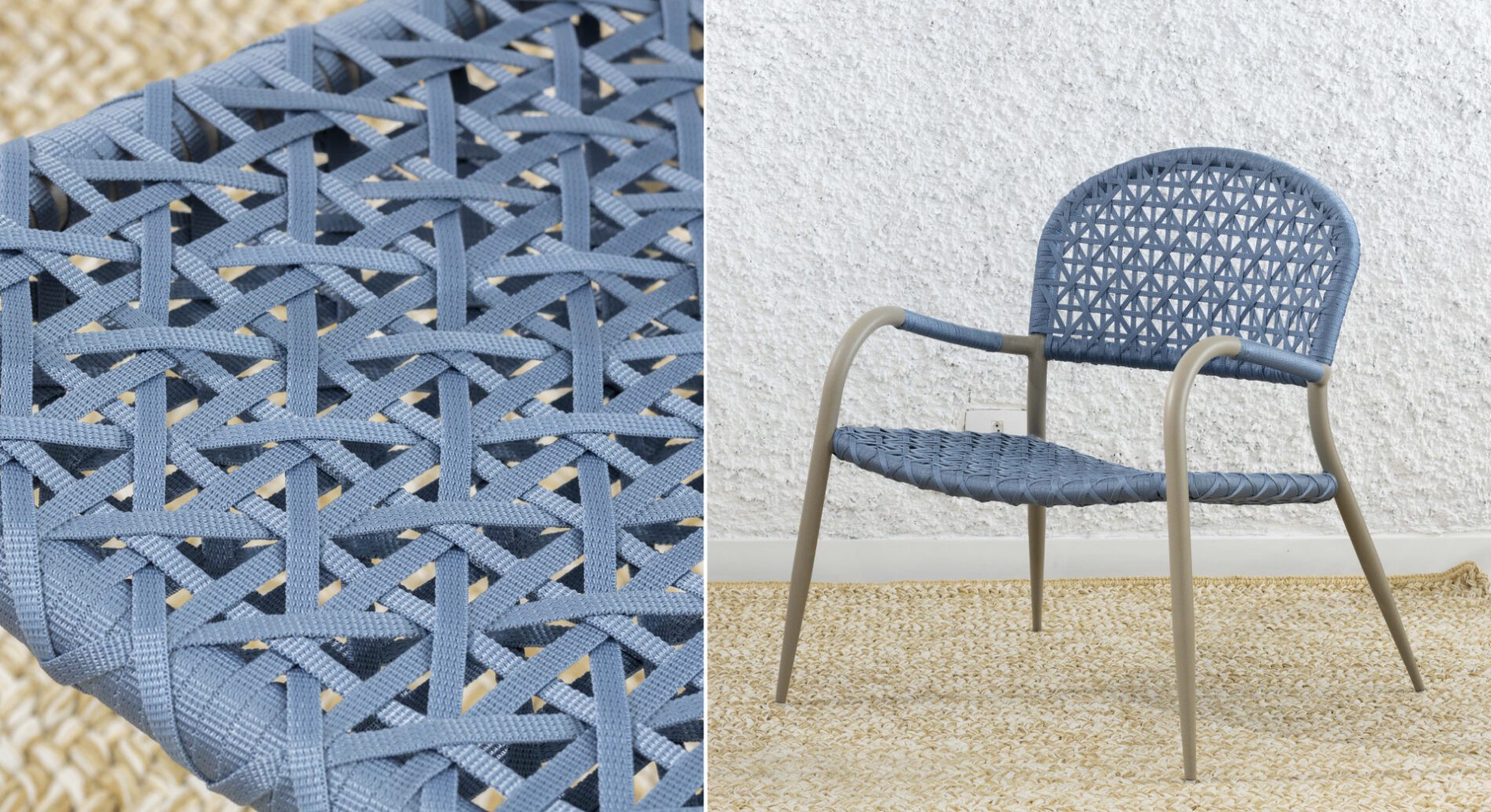 A cadeira Gama traz em sua estrutura moderna um contraponto ao visual caloroso da trama artesanal, com assinatura do estúdio Zanocchi & Starke | Foto: Divulgação