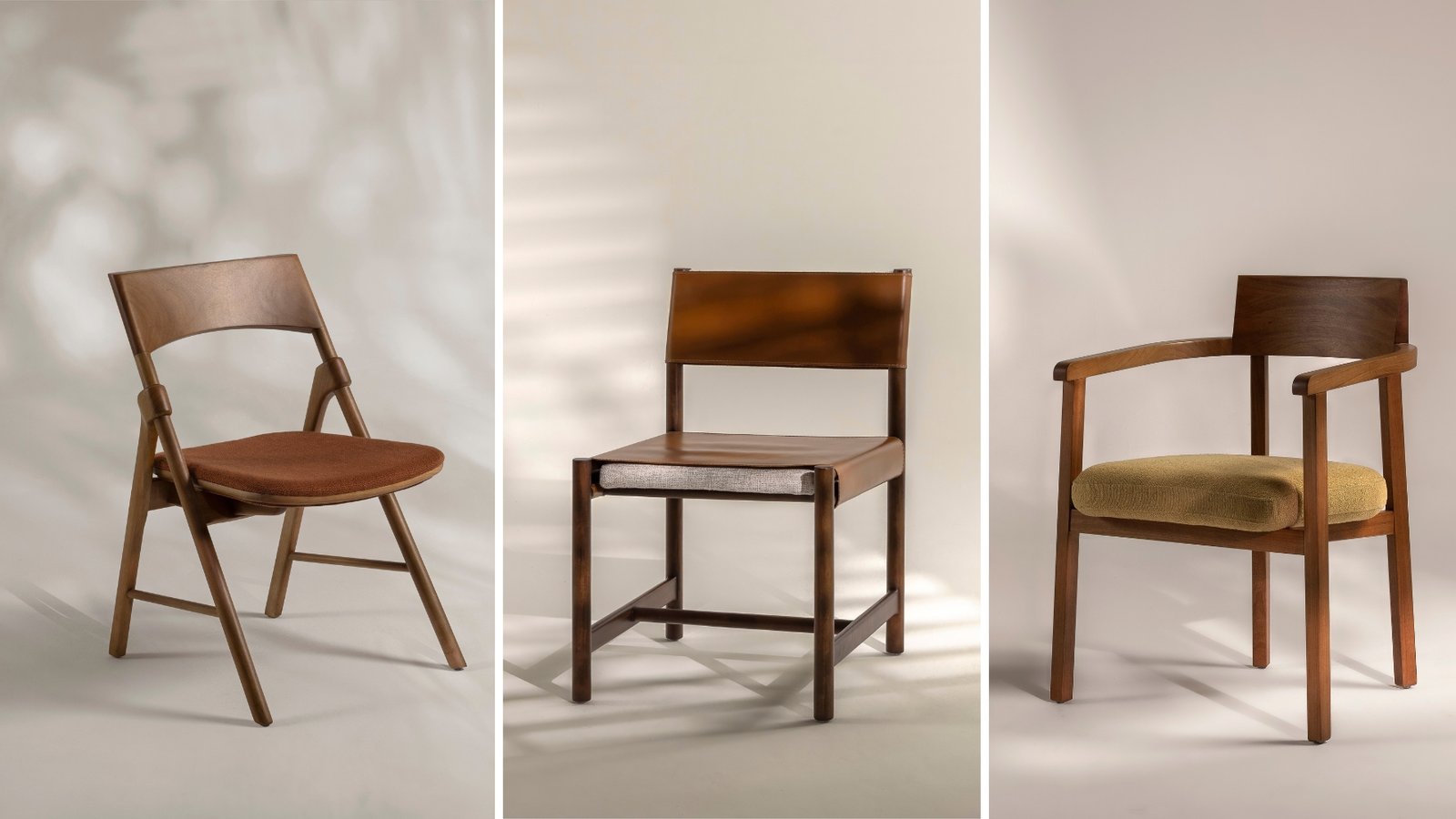 As cadeiras do novo portfólio chamam a atenção pela personalidade forte. Na Cúrcuma, desenhada pela Plataforma4, a linha diagonal formada pelo encosto e o pé dianteiro define o desenho da peça. A Uçá, de Larissa Catossi, faz referência ao caranguejo que habita os manguezais brasileiros e busca traduzir resistência e adaptação por meio de assento e encosto feitos de couro natural tensionado. Nos modelos Ada, Ciranda e Marco, do Estúdio Lider, o modo como a estrutura de madeira é construída e interage com as partes estofadas se torna uma atração em si.