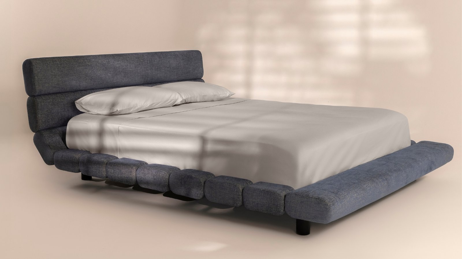 A cama Luna, da Lattoog, possui silhueta curva desenhada por gomos estofados e parece flutuar, graças aos pés recuados | Foto: Jomar Bragança