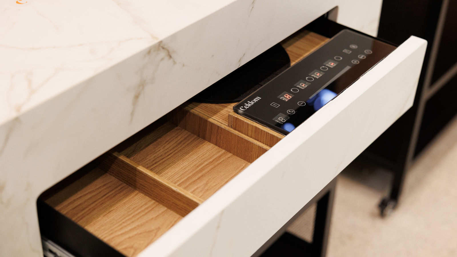 O Seamless by CELDOM apresenta uma nova abordagem para o design das cozinhas ao incorporar a tecnologia de indução sob a bancada, tornando o cooktop praticamente imperceptível no ambiente. Ao eliminar elementos aparentes, a solução privilegia a continuidade das superfícies e amplia o papel da pedra como componente central do projeto, favorecendo composições mais limpas.