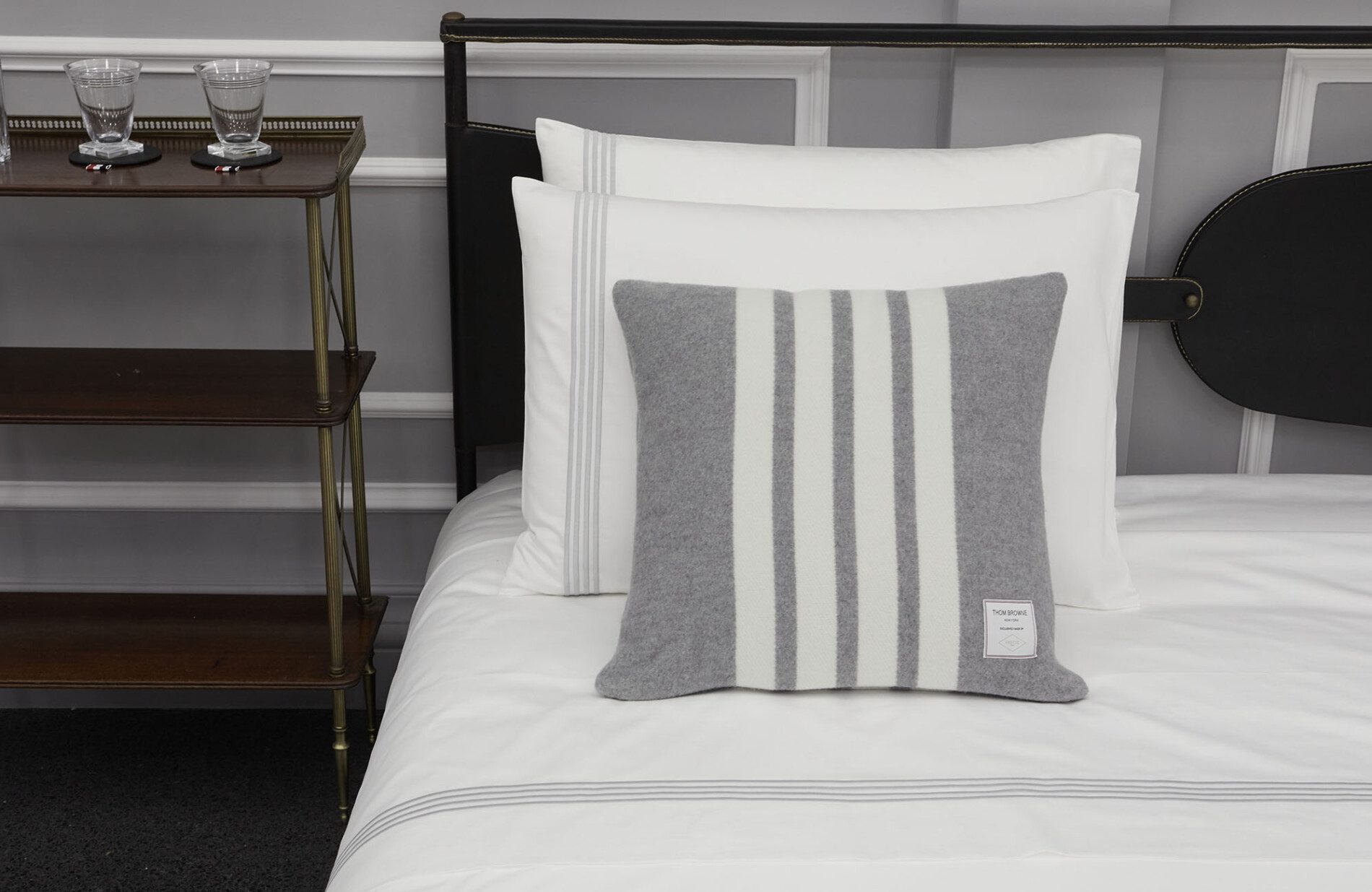Para a Semana de Design de Milão, a parceria veio junto à italiana Frette, centenária fabricante de lençóis de luxo. A coleção em cinza e branco traz as quatro barras indicativas do designer em tecido de cetim de algodão para os lençóis, toalhas felpudíssimas e manta, cobertor e almofada feitos com mistura de lã e caxemira. Além destes itens, Browne trouxe a teatralidade de seus desfiles para a performance-instalação que promovia a coleção.