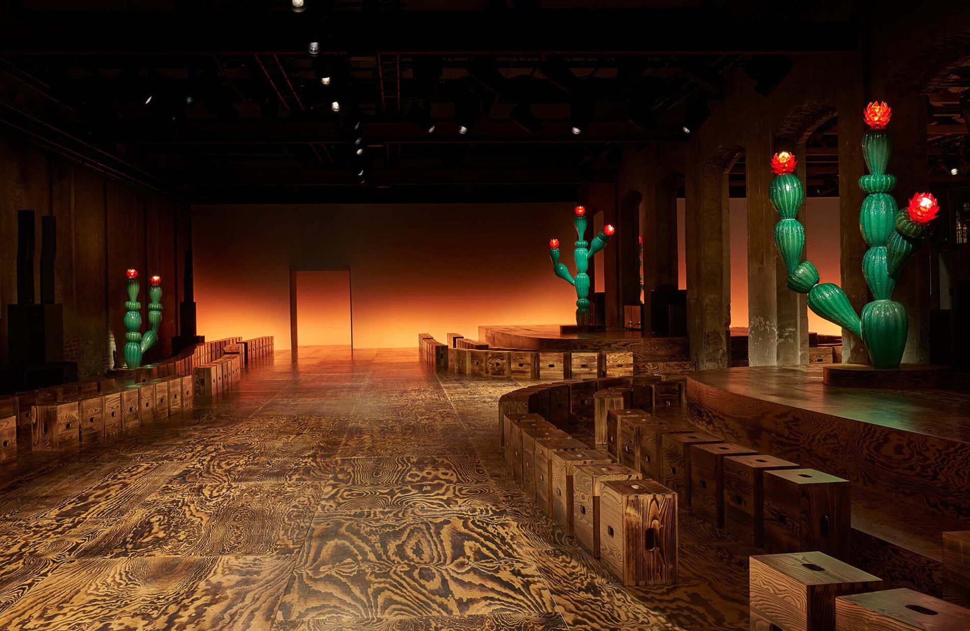 A Hermès fez um convite a quem visitou sua exposição The Topography of Material, no Spazio Pelota, durante a Semana de Design de Milão: “sair do tempo, mantendo os pés no chão”. O ambiente escuro conduzia o olhar do visitante na direção do piso, composto por padronagens em tons de marrom, vermelho e cinza.