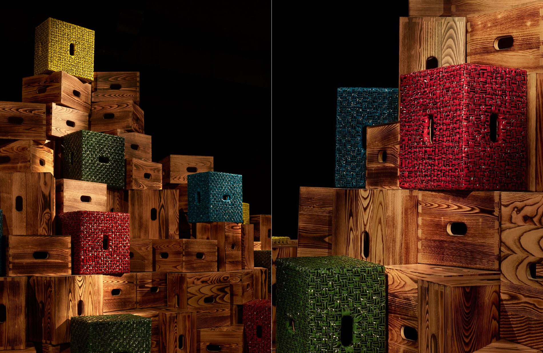Na instalação, há versões personalizadas em madeira, desenvolvidas para o desfile de inverno da Bottega Veneta a pedido do diretor criativo Matthieu Blazy, aliadas a outras em couro exclusivo da maison e trançado pela técnica Intreccio Foulard, nas cores amarelo, vermelho, azul e verde raintree.