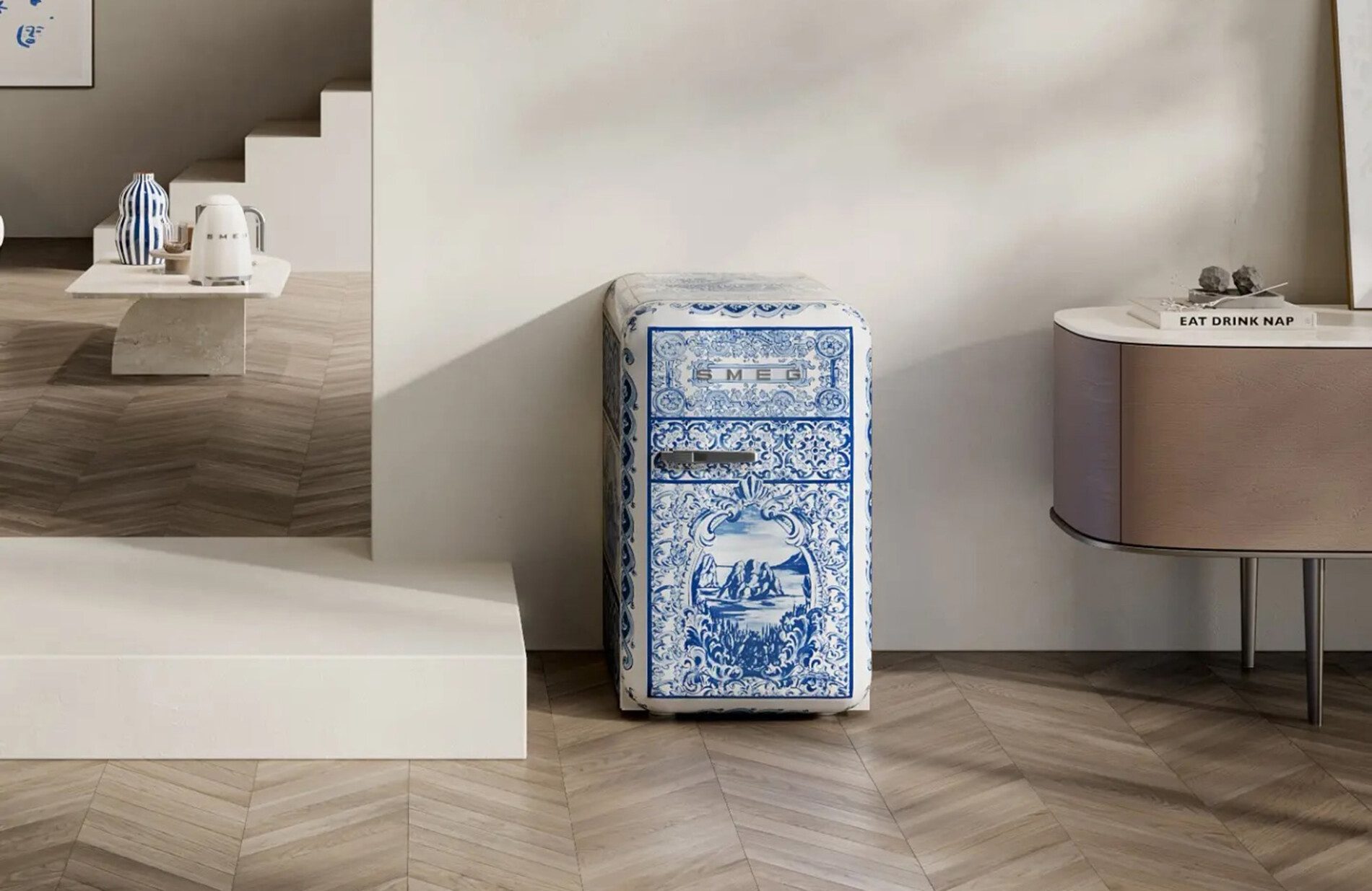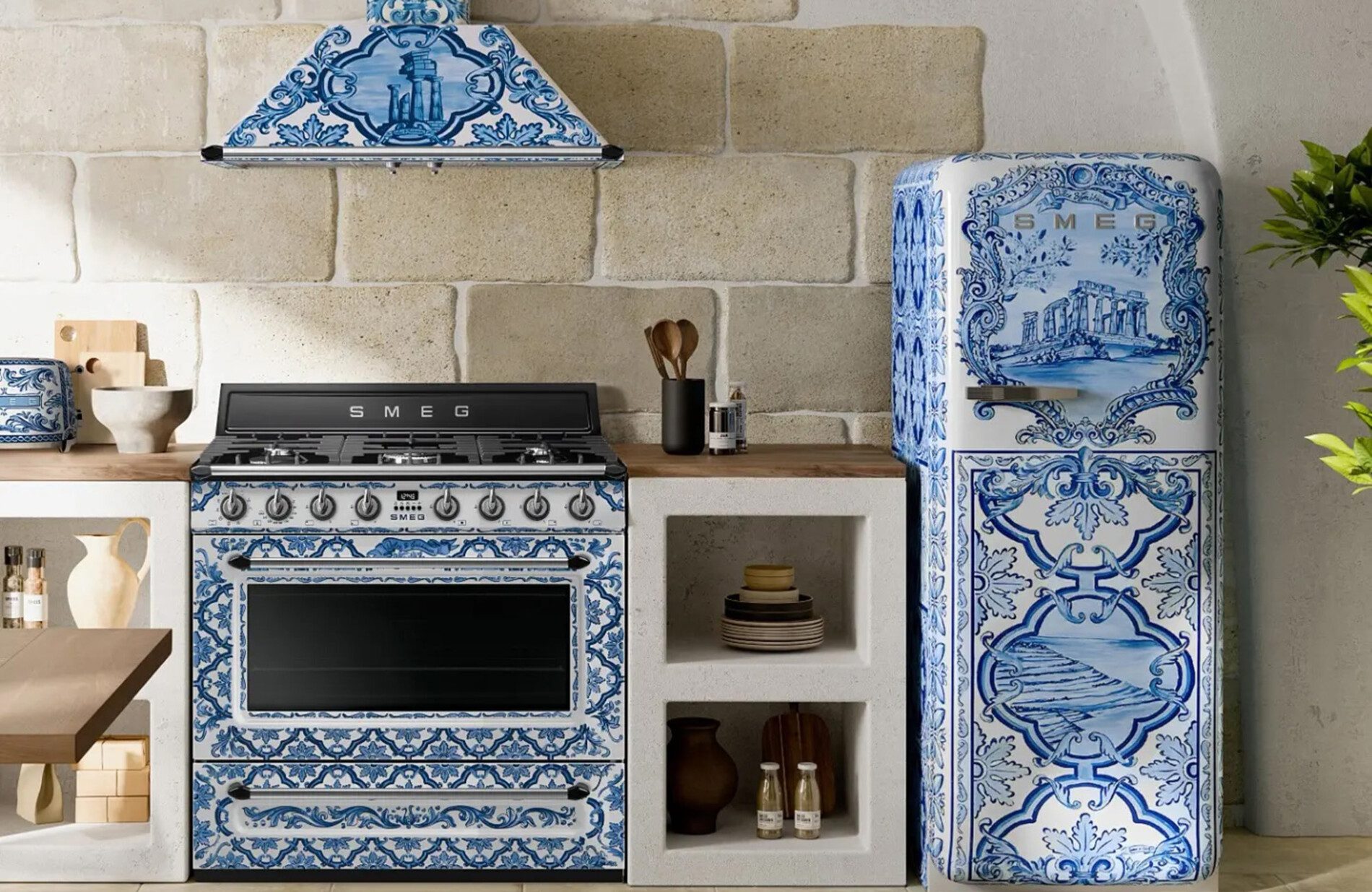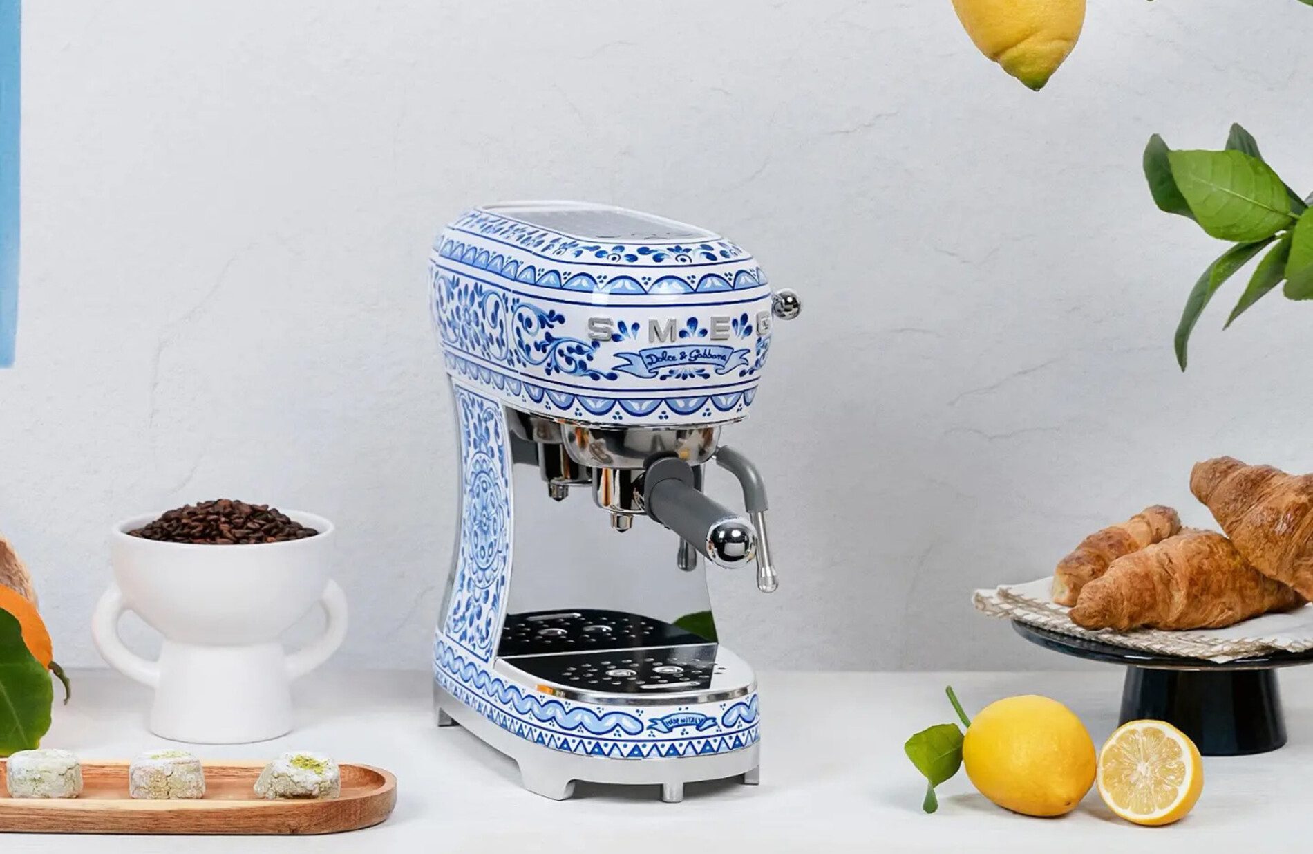 Além da mostra, a D&G apresentou a Blu Mediterraneo com a Smeg na Eurocucina, como uma nova etapa da parceria entre as empresas. A collab já conta quase uma década e traz eletrodomésticos e eletros – a exemplo de cafeteira, torradeira e chaleira – estampados em branco e azul e com inspiração na faiança renascentista majólica. A estampa também está em uma cafeteira Moka da italiana Bialetti.