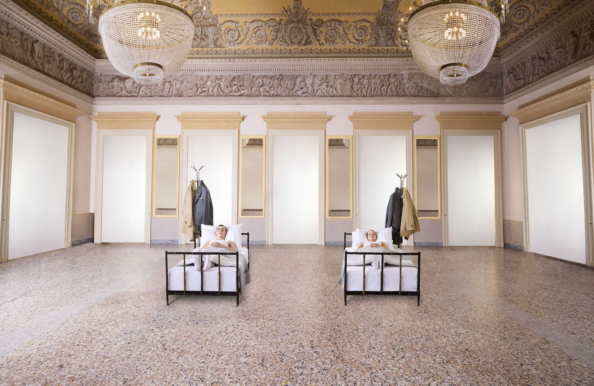 Junto ao Parco Sempione, a neoclássica Palazzina Appiani abriu seu hall central para seis leitos datados do meio do século passado, arrumados com os novos jogos de cama da collab. Um a um, modelos entravam e circulavam pela sala em penumbra e, ao som de músicas clássicas e de ninar, se vestiam com as roupas dispostas em mancebos. Alinhadíssimos, deitavam-se para dormir. O final você pode descobrir aqui.