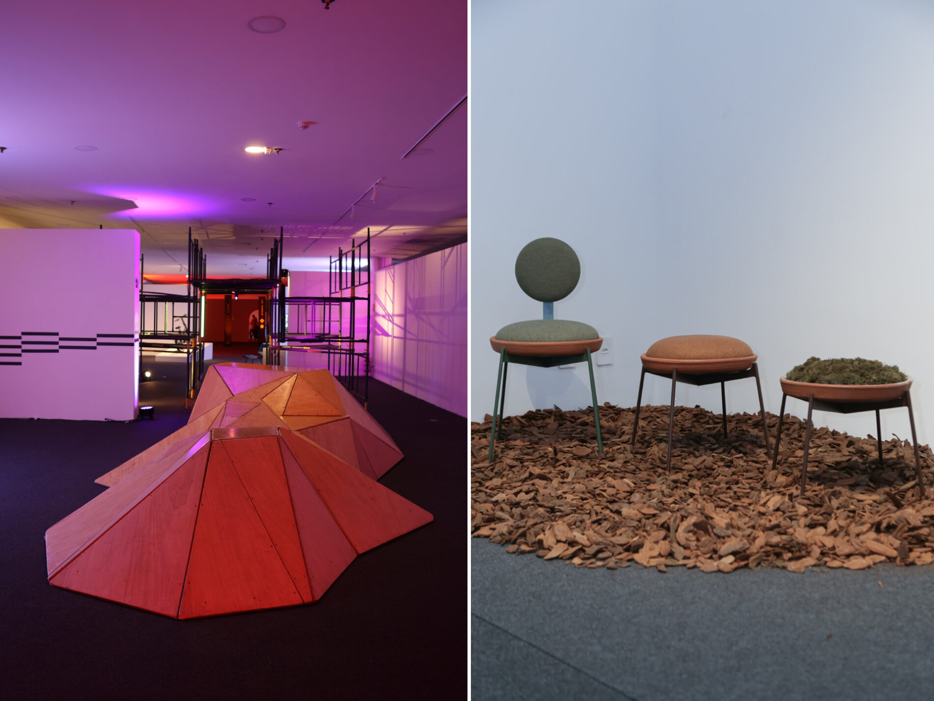 A área dedicada à escala do ambiente abriga móveis, luminárias e acessórios. Nesse espaço, o conforto é atributo primordial, mas a curadoria também lançou seu olhar para peças que contam boas histórias, caso da poltrona Varal. “Ela utiliza como estofamento 20 camadas de tapetes produzidos em tear manual no interior de Minas Gerais, estado natal do designer Porfírio Valadares”, revela Winnie. “É um exemplo de como um trabalho tradicional pode se tornar um produto inovador.”