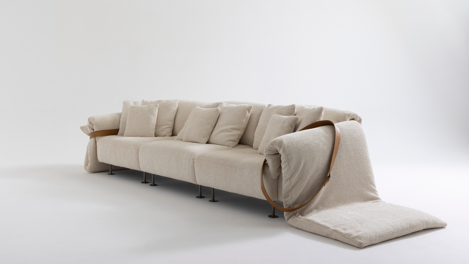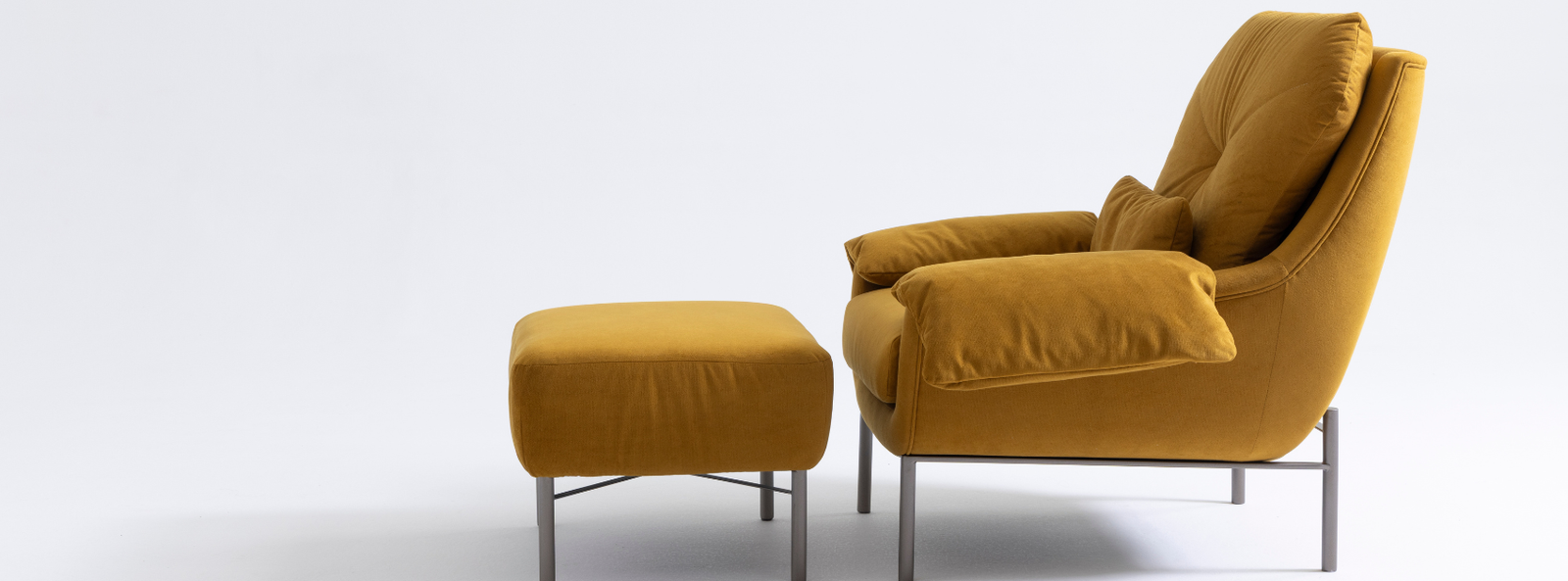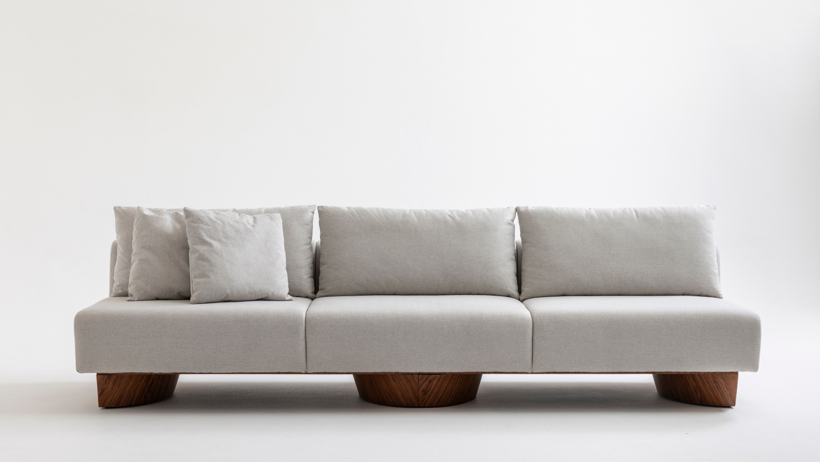 Entre os estofados, o Sofá Alvorada se destaca pela base formada por arcos de madeira laminada. O Sofá Orelha enfatiza o acolhimento por meio de volumes arredondados e braços com dobras funcionais destinadas ao apoio de objetos cotidianos. A Poltrona Serata complementa o conjunto ao propor uma peça voltada ao descanso, combinando linhas de inspiração modernista com estofado generoso.
