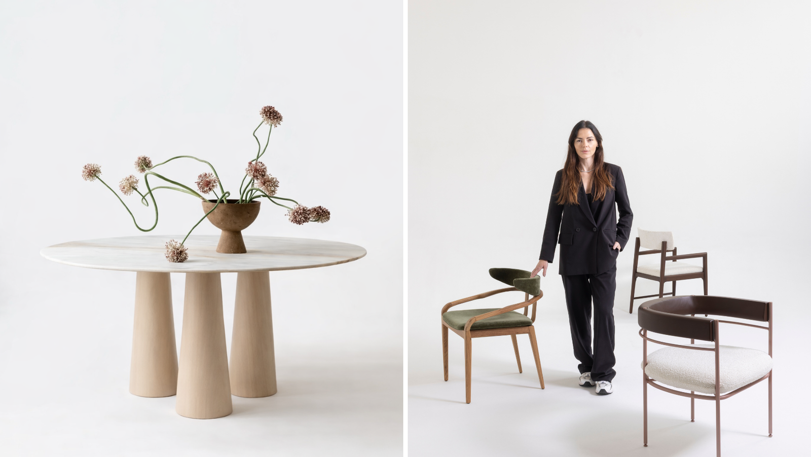 A Cadeira Brisa, já presente no portfólio da designer, retorna em novas versões com encosto estofado e braços, reforçando a ideia de continuidade por meio da atualização de um desenho existente. No mesmo sentido, a Mesa Tre sintetiza o princípio de equilíbrio ao estruturar-se sobre três apoios.