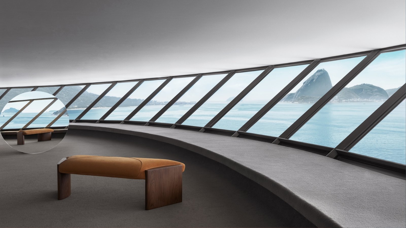 O banco longitudinal Janus leva o nome do deus das transições e foi pensado para dividir ambientes | Foto: Marco Antonio