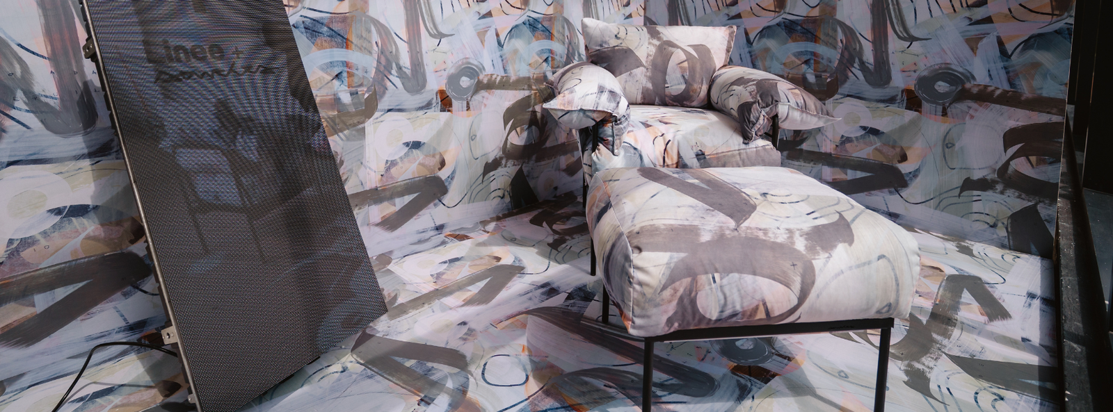 A releitura nasce da colaboração com o artista multidisciplinar Rafael Sanches, cuja produção transita entre pintura, arquitetura, moda e performance. Em sua pesquisa, o artista trabalha com ritmo, fragmentação e sobreposição de elementos gráficos — princípios que se traduzem na estampa Bi(o)dimensionalidade, criada especialmente para a peça. Ao incorporar essa linguagem, o estofado passa a atuar como uma superfície expressiva, trazendo novas camadas de significado ao desenho original da poltrona.
