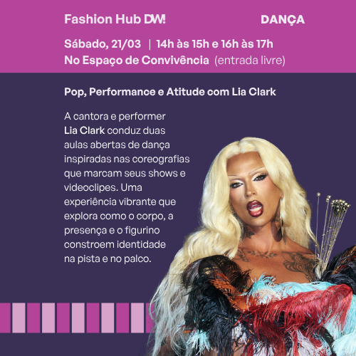 A cantora e performer conduz uma aula aberta de dança que conecta pop, performance e expressão de estilo. Inspirada nas coreografias que marcam seus shows e videoclipes, a atividade convida o público a experimentar movimentos acessíveis e cheios de atitude, explorando como o corpo, a presença e o figurino constroem identidade na pista e no palco. Entre passos coreografados e momentos de improviso, a aula propõe um encontro entre música, moda e cultura pop, celebrando a liberdade de expressão e a potência do corpo como ferramenta criativa. Uma experiência vibrante para quem quer dançar, se divertir e entrar no clima do Fashion Hub.