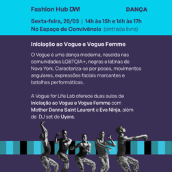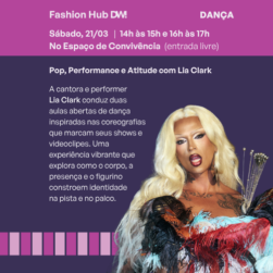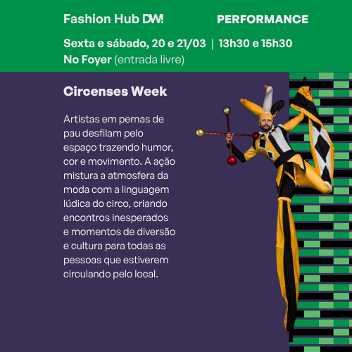 Intervenção com arte e surpresa ao público: artistas em pernas de pau desfilam pelo espaço trazendo humor, cor e movimento. A ação mistura a atmosfera da moda com a linguagem lúdica do circo, criando encontros inesperados e momentos de diversão para todas as pessoas que estiverem circulando pelo local.