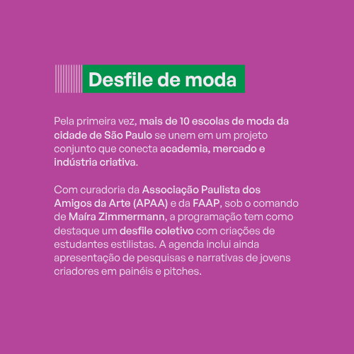 Pela primeira vez, escolas de moda da cidade de São Paulo se unem em um projeto conjunto que conecta academia, mercado e indústria criativa. O curso de moda da FAAP coordena a participa de um desfile coletivo que reúne o Centro Universitário Belas Artes de São Paulo, USP | EACH, Centro Universitário das Américas | FAM, Faculdade Santa Marcelina (FASM), FMU | FIAM-FAAM, IED São Paulo, ESPM | Panamericana Escola de Arte e Design, Centro Universitário Senac, Centro Universitário SENAI SP e Universidade Anhembi Morumbi (UAM). Criações de estudantes estilistas das instituições participantes evidenciam a diversidade de pesquisas e linguagens presentes na formação em moda na cidade de São Paulo.