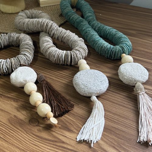 Montagem de colar de mesa feita em pedra de biocerâmica e caixas ovos