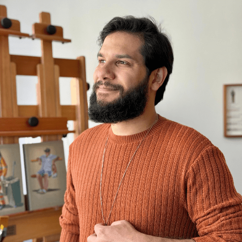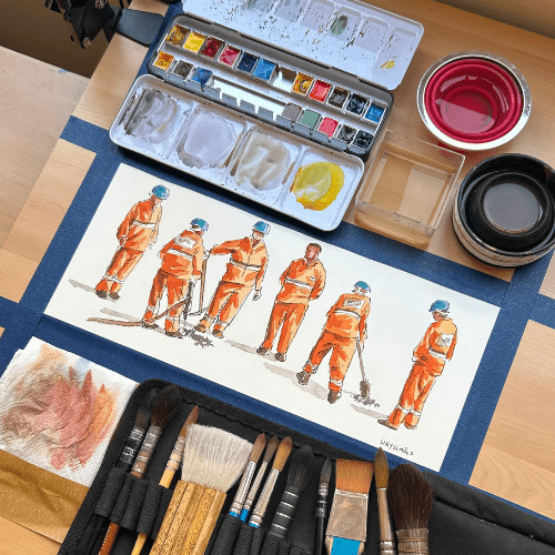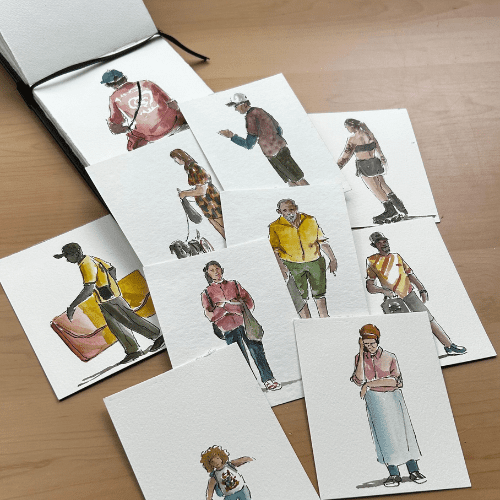 Iury Simões, o Poeta das Cores, recepciona os convidados para a roda de conversa “Criando um Poema”. Enquanto aquarela ao vivo, o artista conversa sobre memória, sua técnica singular e as histórias por trás de cada rosto que retrata.