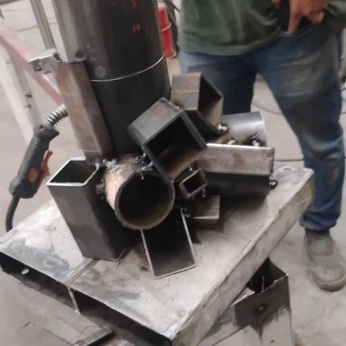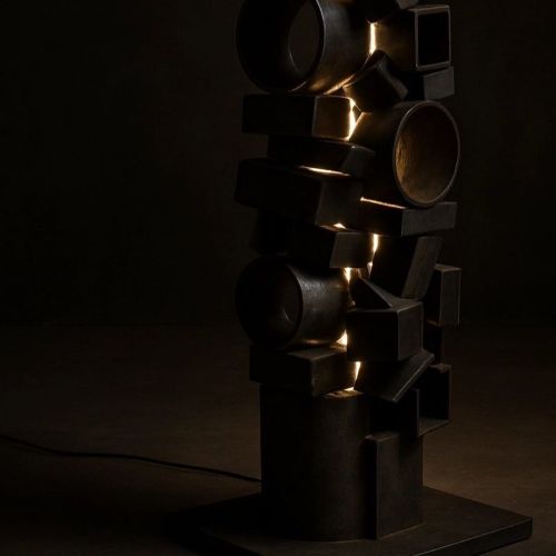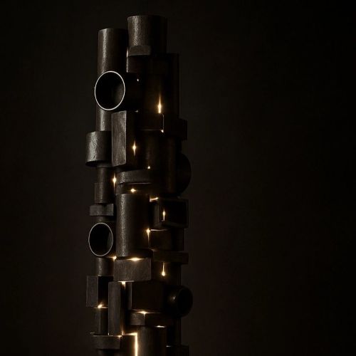 Tó-tem “Ossos industriais: vestígios técnicos empilhados em rito.” Luminária de chão composta por retalhos de metal, chapas, tubos circulares e quadrados, reaproveitados e organizados verticalmente em um empilhamento totêmico, onde a matéria não é magia mas sim vestígio. A luz é gerada por uma lâmpada tubular central, que vaza apenas pelas aberturas e bocas dos tubos, como um eixo energético. Estrutura em metal com acabamento preto fosco. Dimensões aproximadas: 180 cm (A) × 22 cm (Ø), base irregular em chapa metálica.