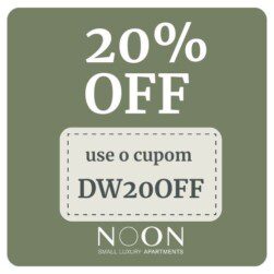 Reserve pelo site oficial do NOON, selecione suas datas e insira o cupom DW20OFF no momento da confirmação. Garanta sua estadia com design, conforto e autonomia.